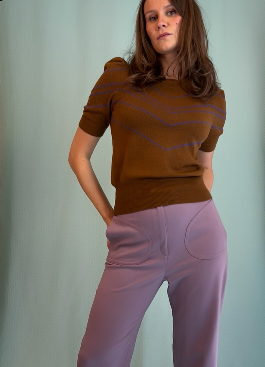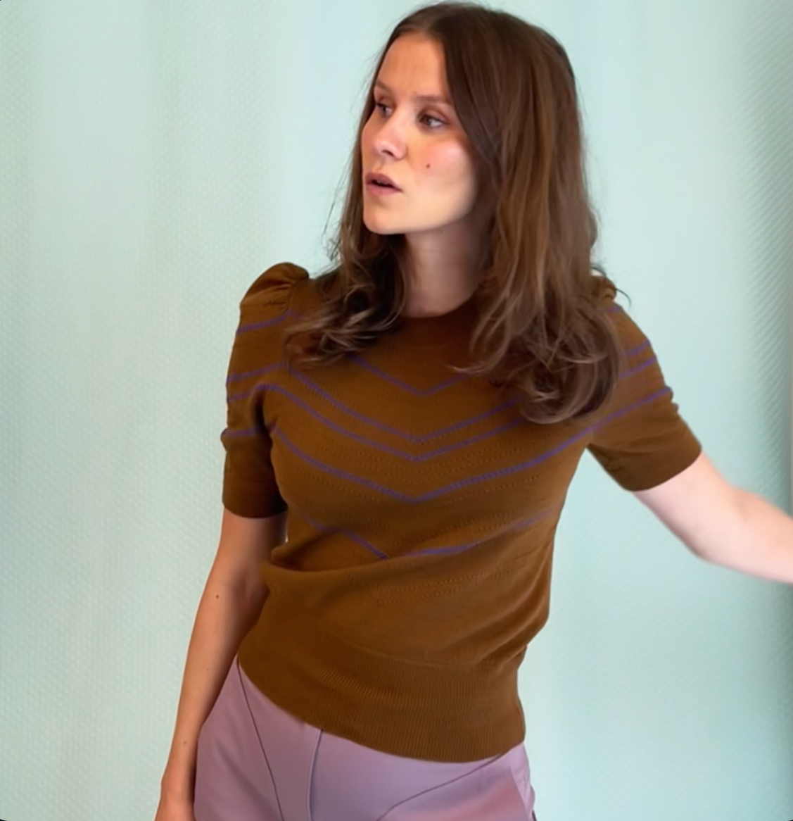 Figur-strikket ultra blød, certificeret ren merino uld strik. Klædeligt og cool pufærme, rund hals og “langt” kort ærme. Fine striber i koboltblå og elegant stribet hul-mønster mellem de blå striber.
