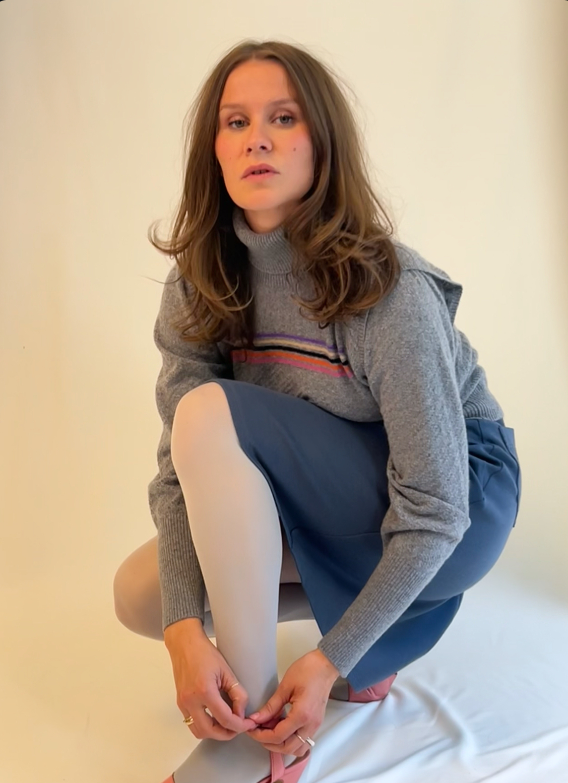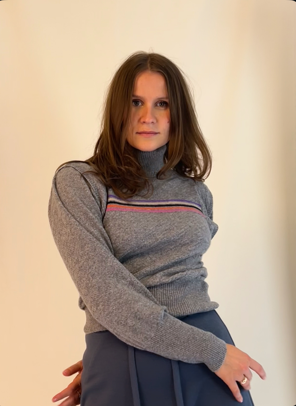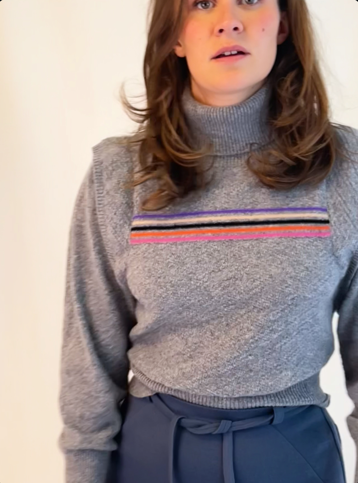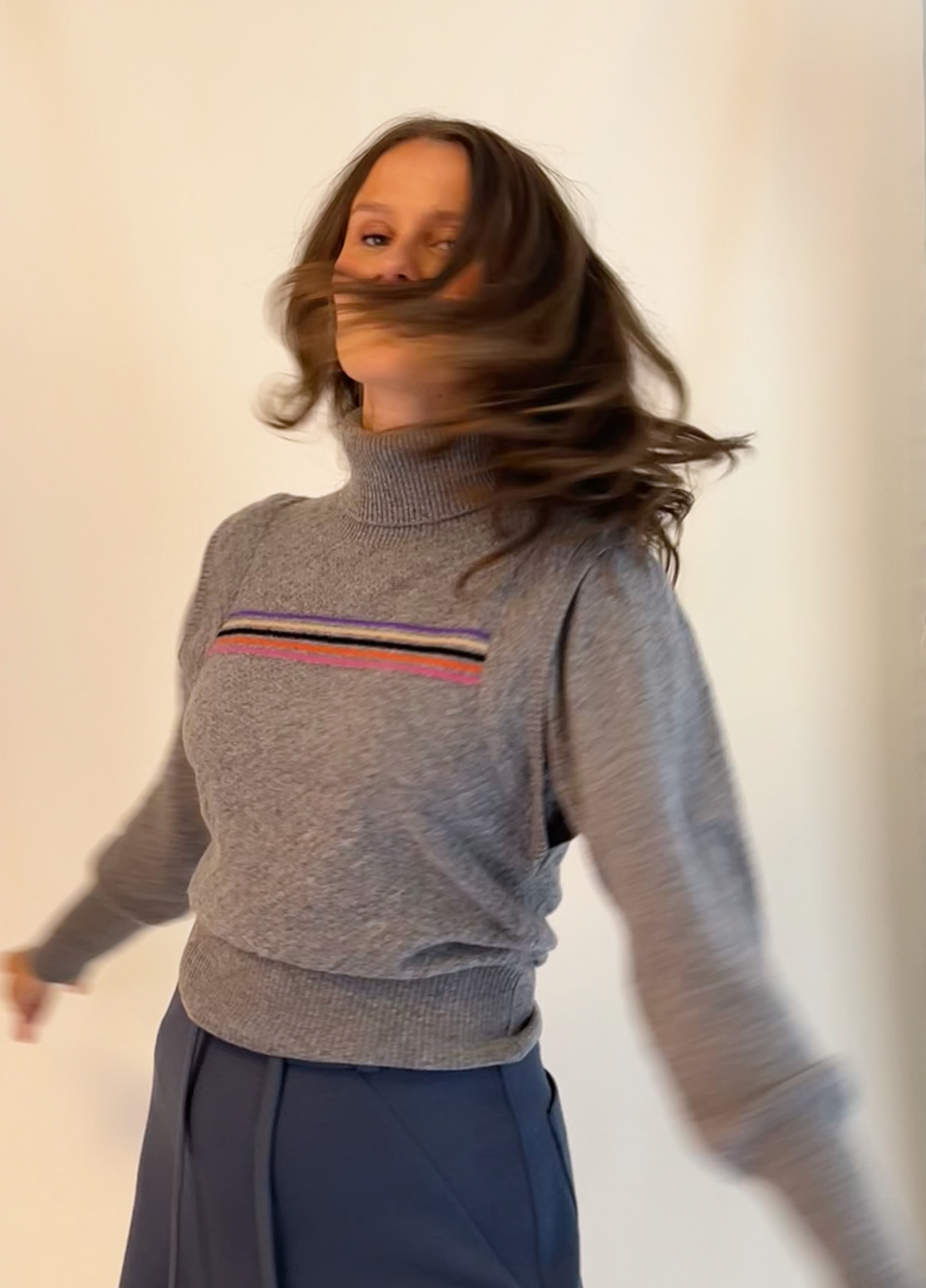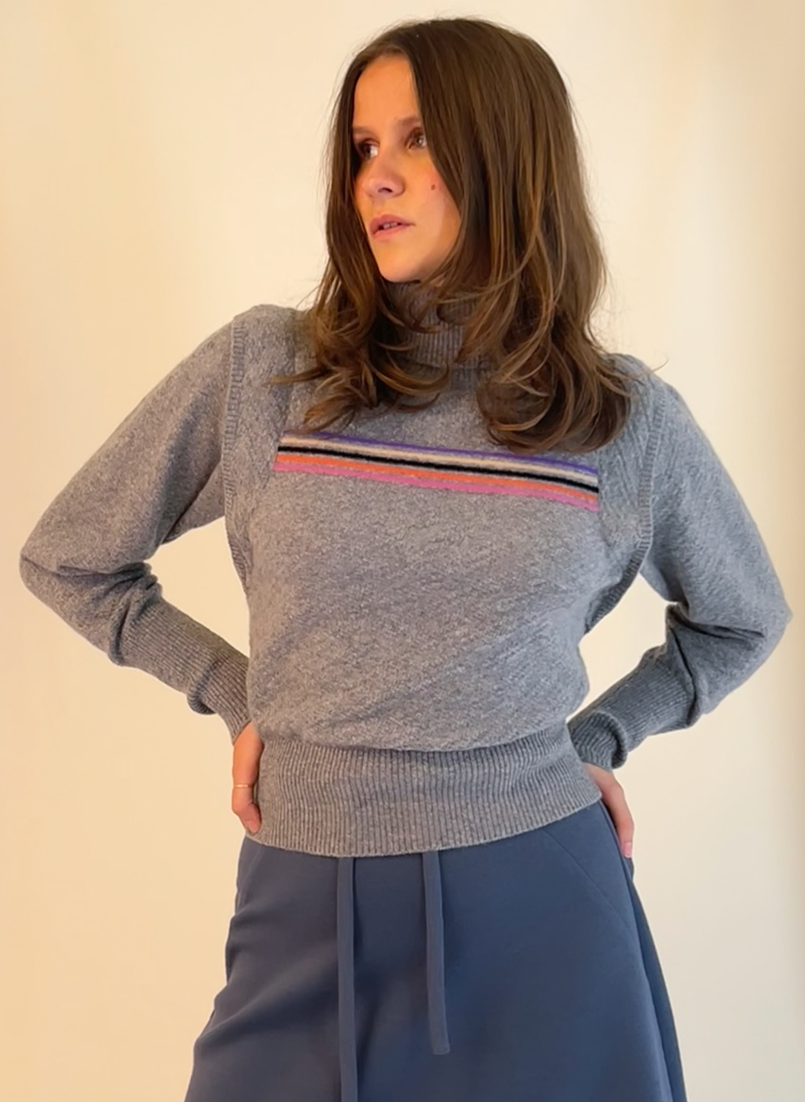 100% cashmere strik i fint skråtstillet mønster og farvede striber på forstykket. Helt lange ærmer med bred rib, høj rullekrave og cool skulder markering.