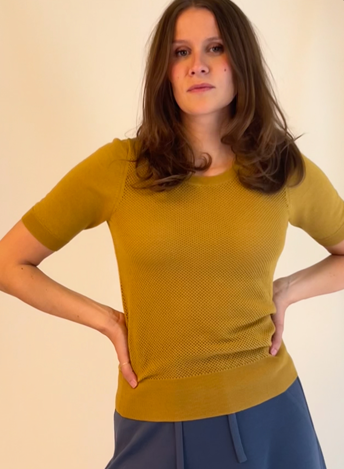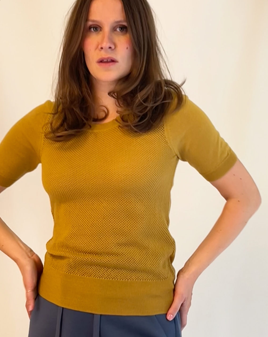 Meget anvendelig, blød, uld tshirt. 100% høj kvalitet certificeret merino uld. Strikket i net på forstykket og i stjernen i nakken. Kort ærme og ryg i glat strik.