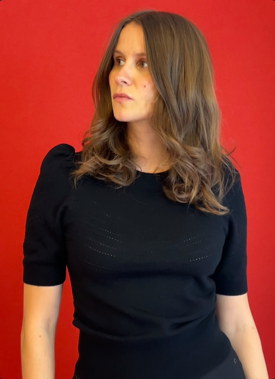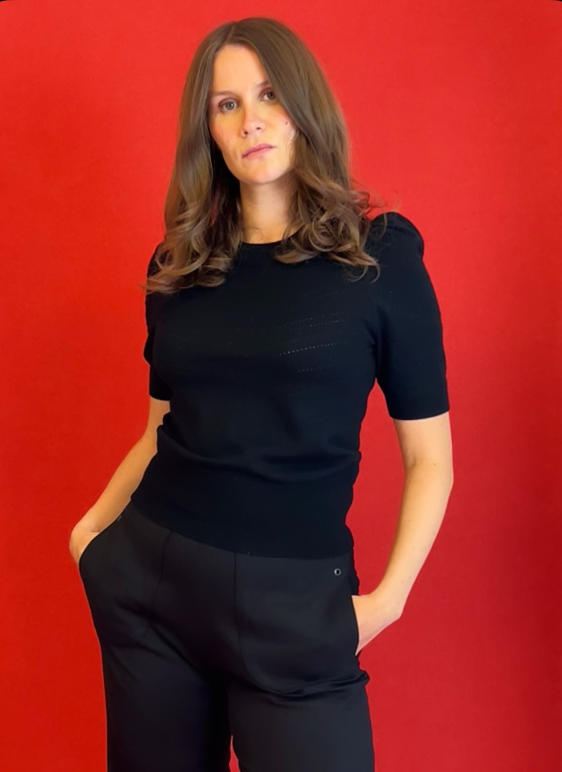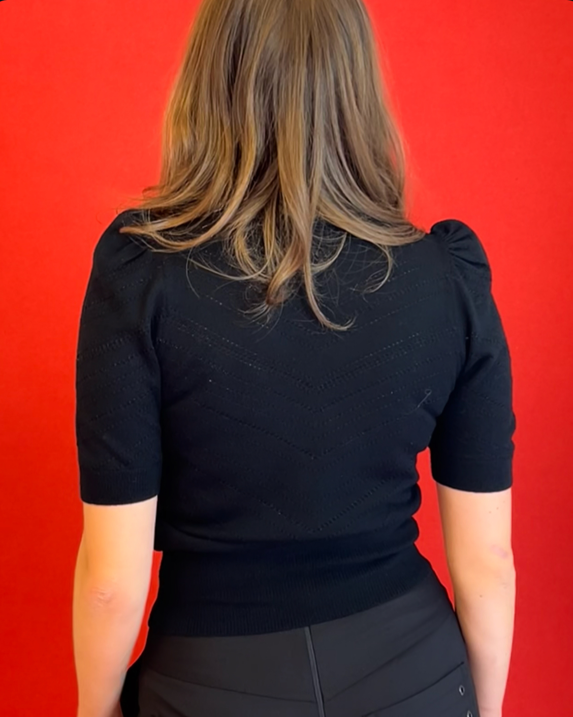 Figur-strikket ultra blød, certificeret ren merino uld strik. Klædeligt og cool pufærme, rund hals og “langt” kort ærme. Fine striber i sort glimmer og elegant stribet hul-mønster mellem glimmerstriberne.