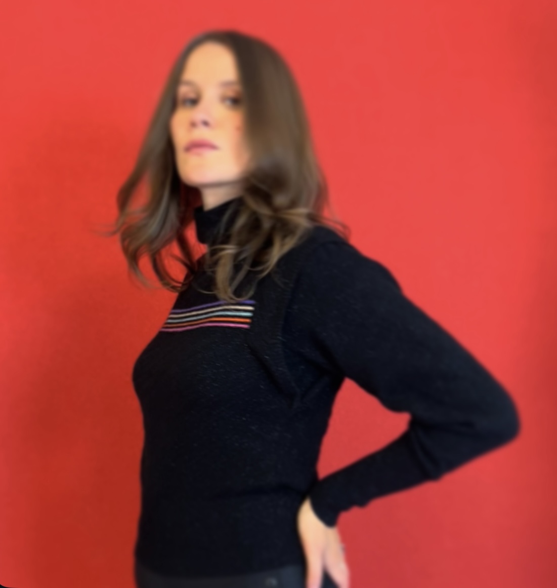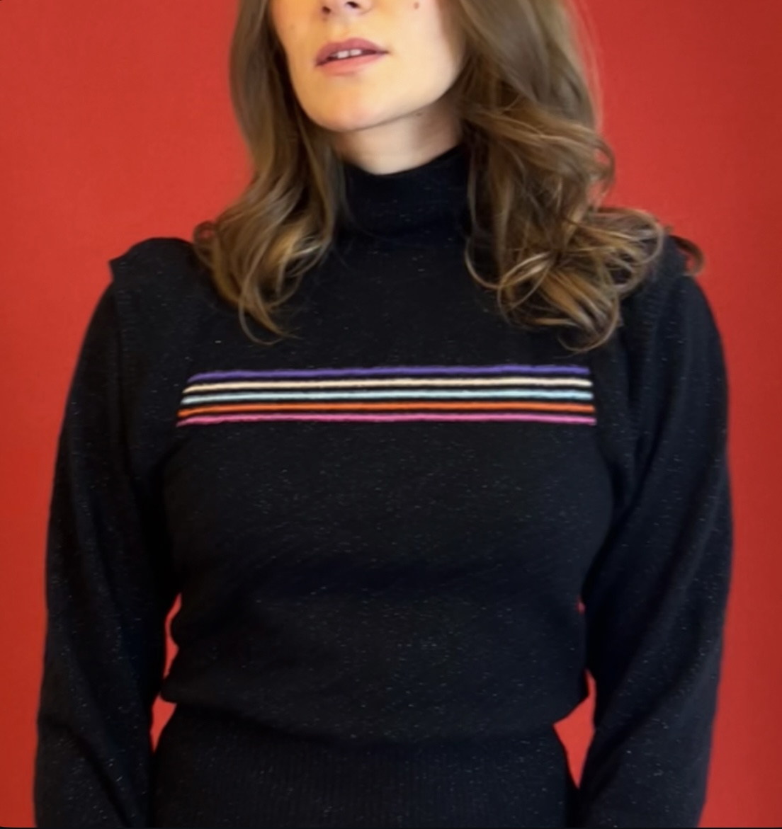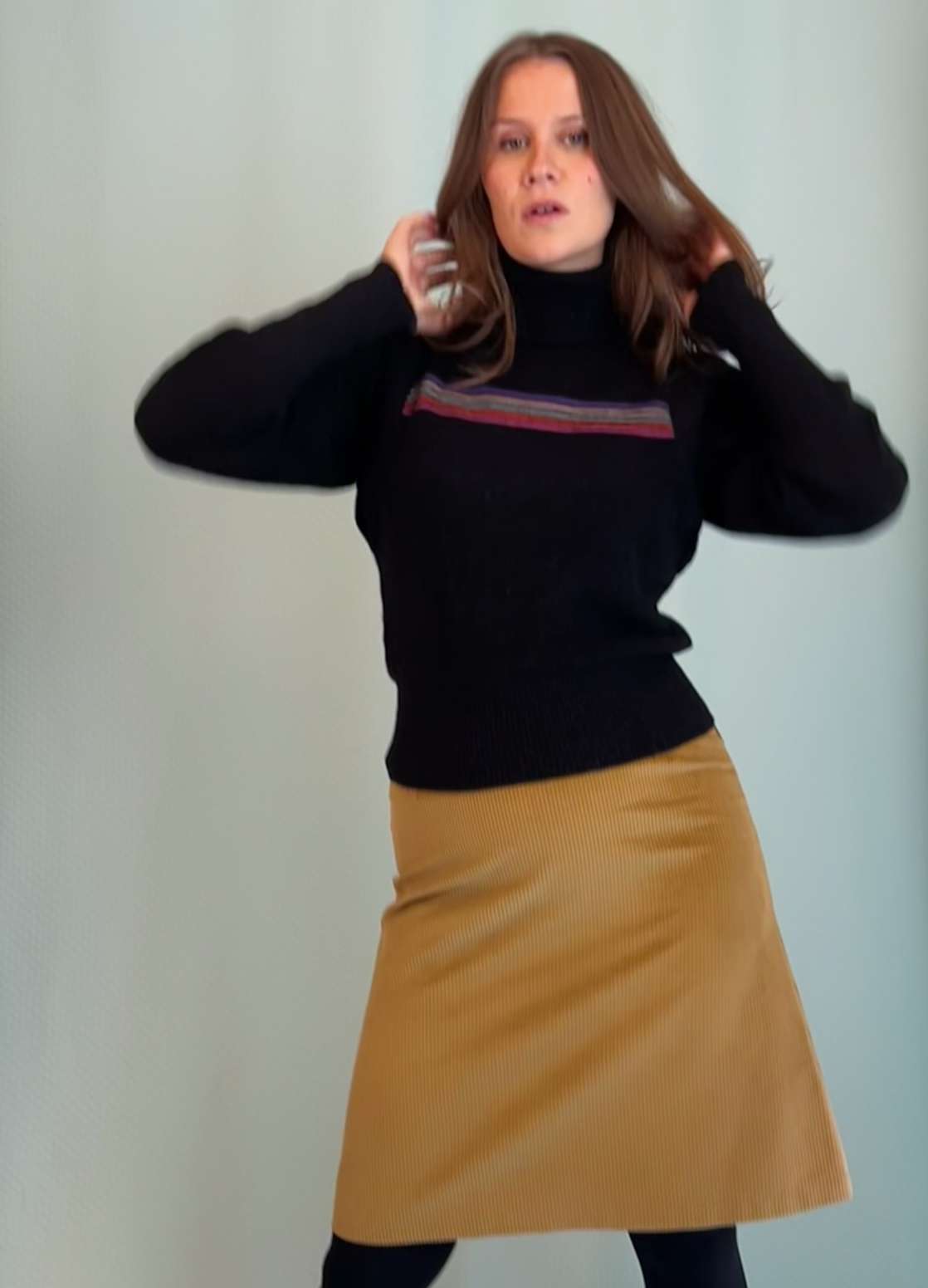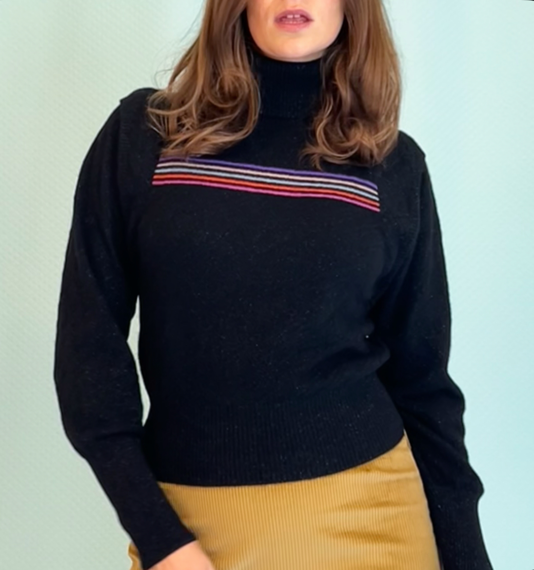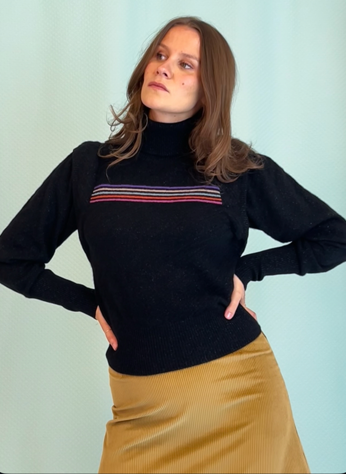 100% cashmere strik i fint skråtstillet mønster og farvede striber på forstykket. Helt lange ærmer med bred rib, høj rullekrave og cool skulder markering.