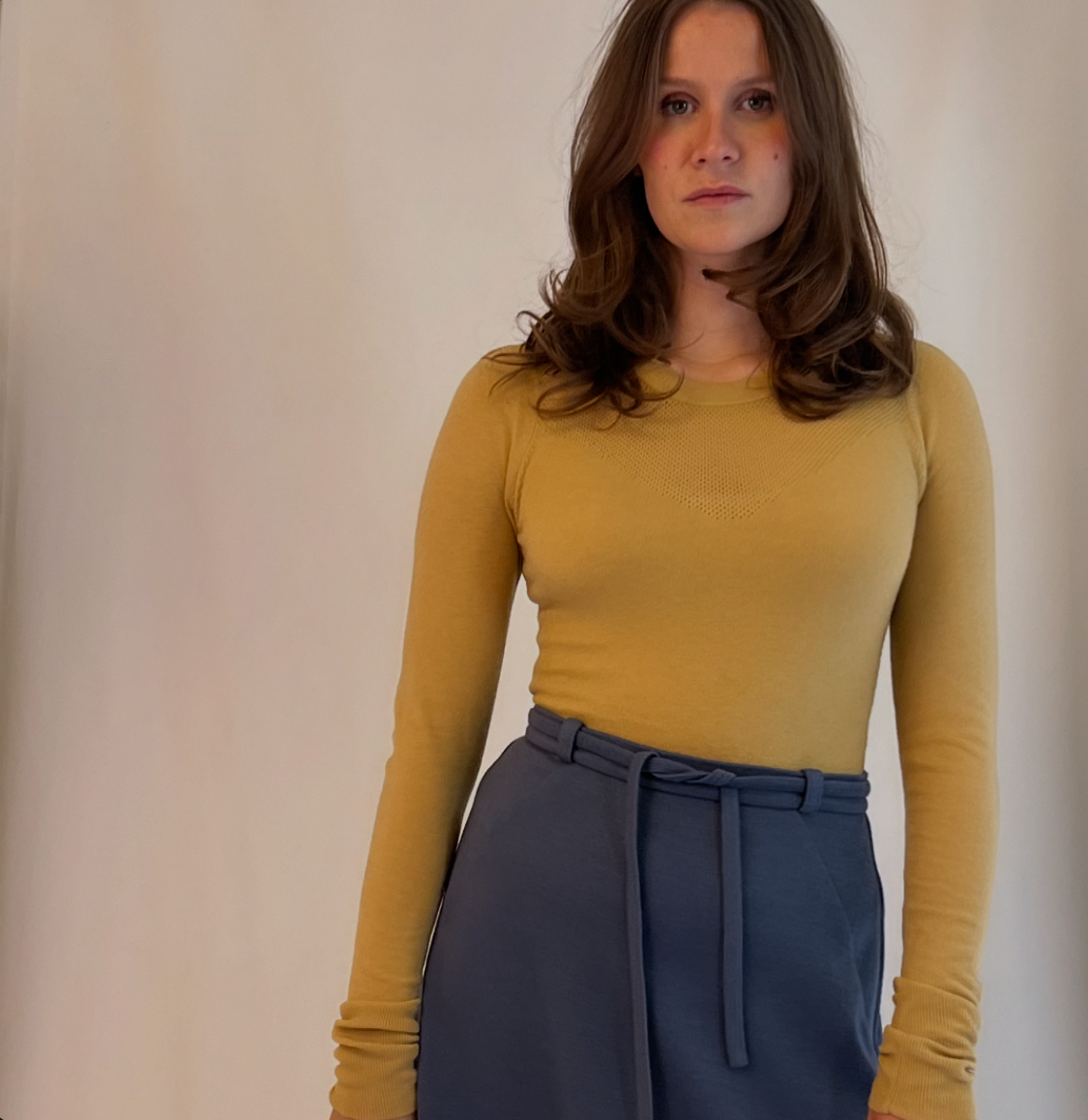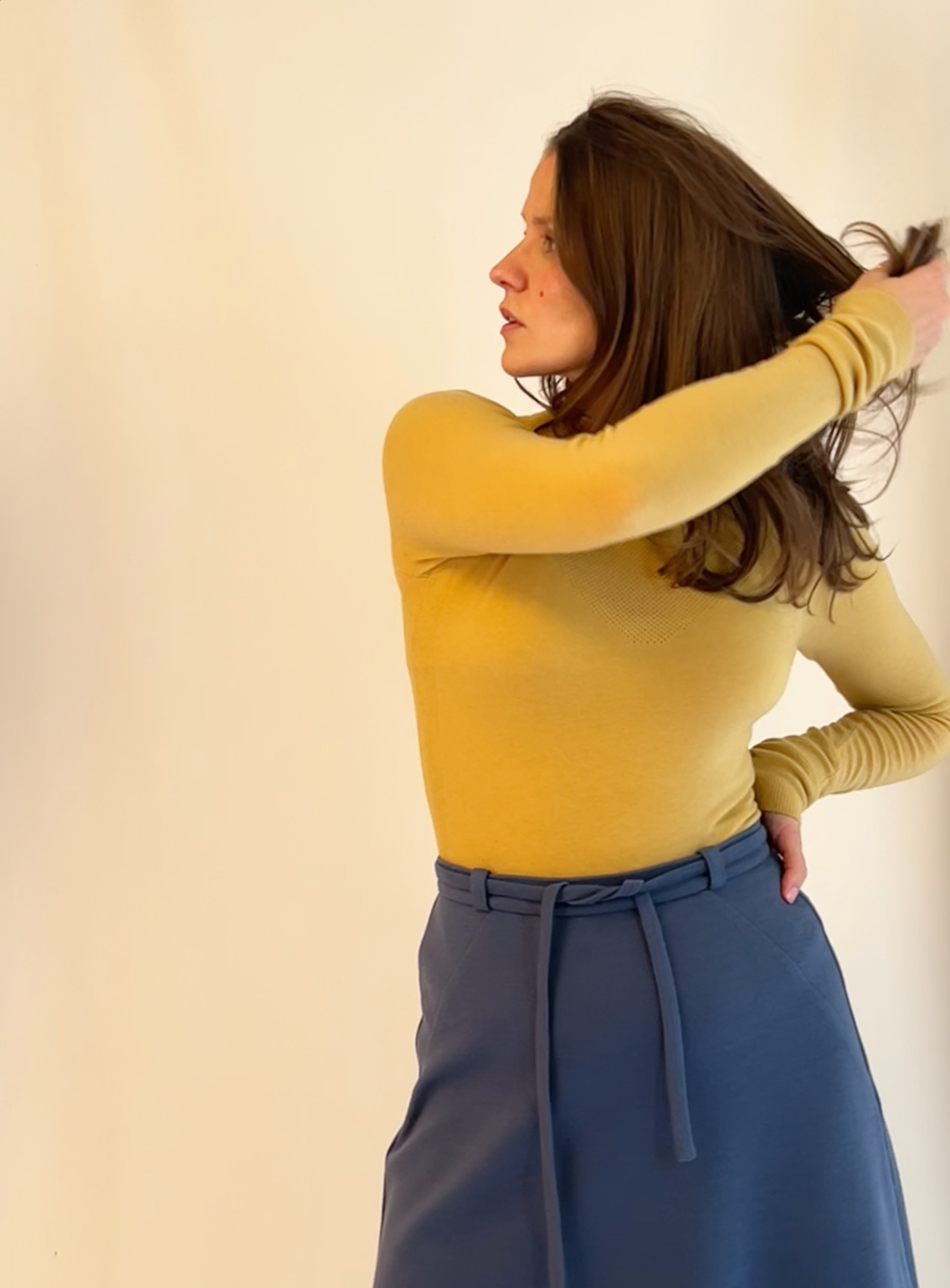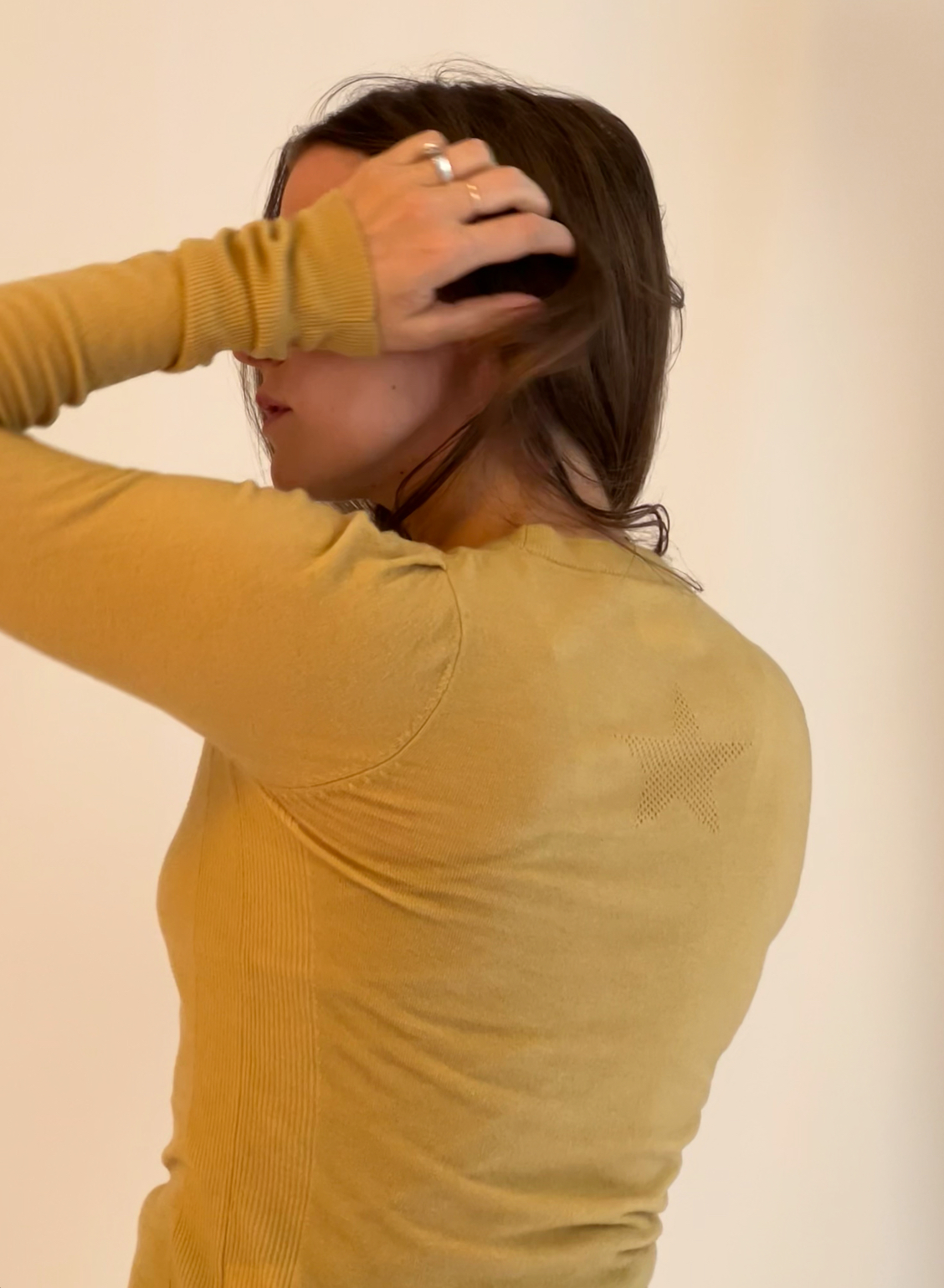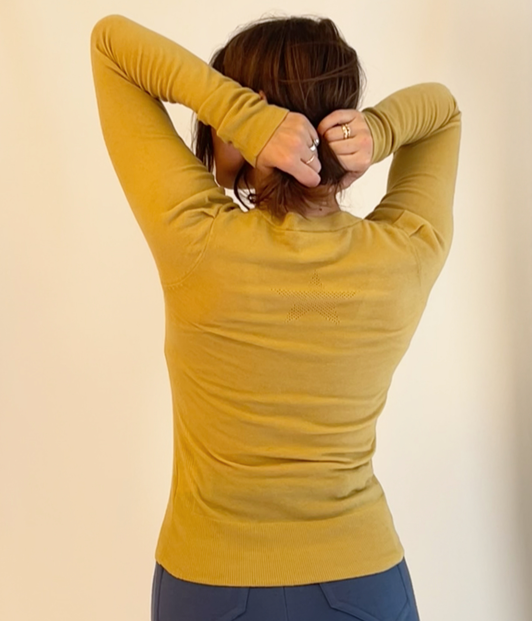 Langærmet fnuglet 100% uld. Helt tynd, meget flexibel. Ekstra langt ærme. Net-strik foran øverst og som diskret stjerne bagpå øverst.